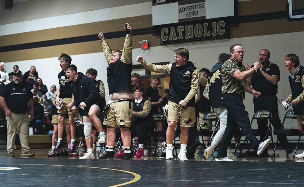 The Aquinas bench celebrates a big dual win over David City. (For Harvest Sports / Jose Lopez, NEWrestle)