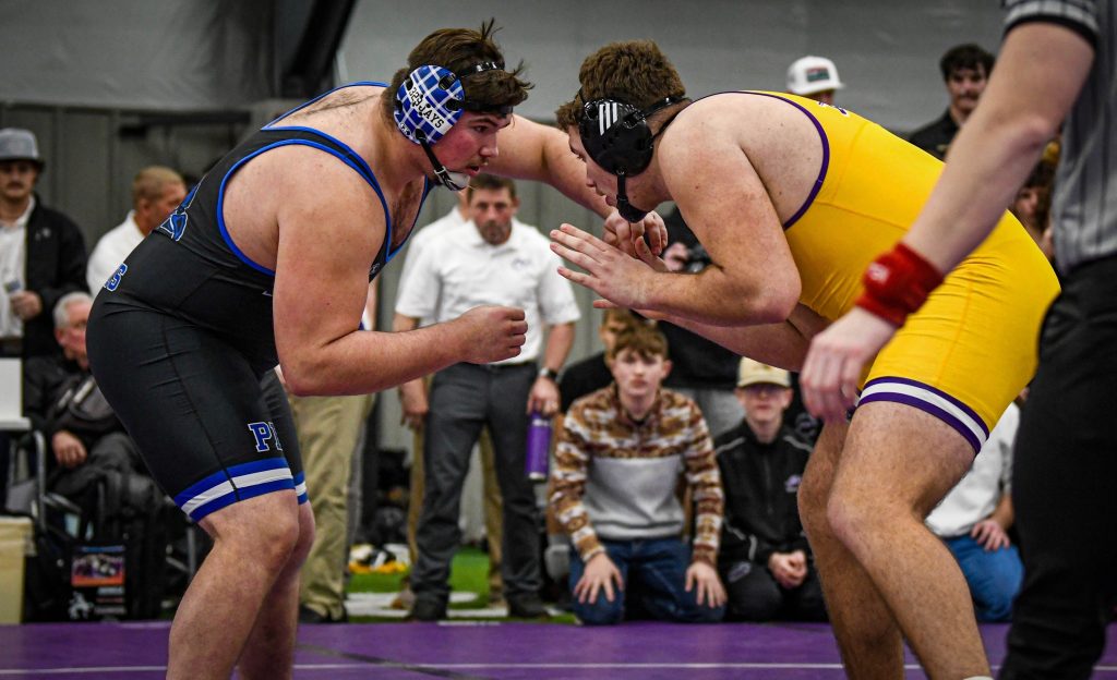 Pierce’s Boston Krueger (left) and Connor Heiderman of Battle Creek wreste earlier this season. (For Harvest Sports / Tyler Last, NEWrestle)