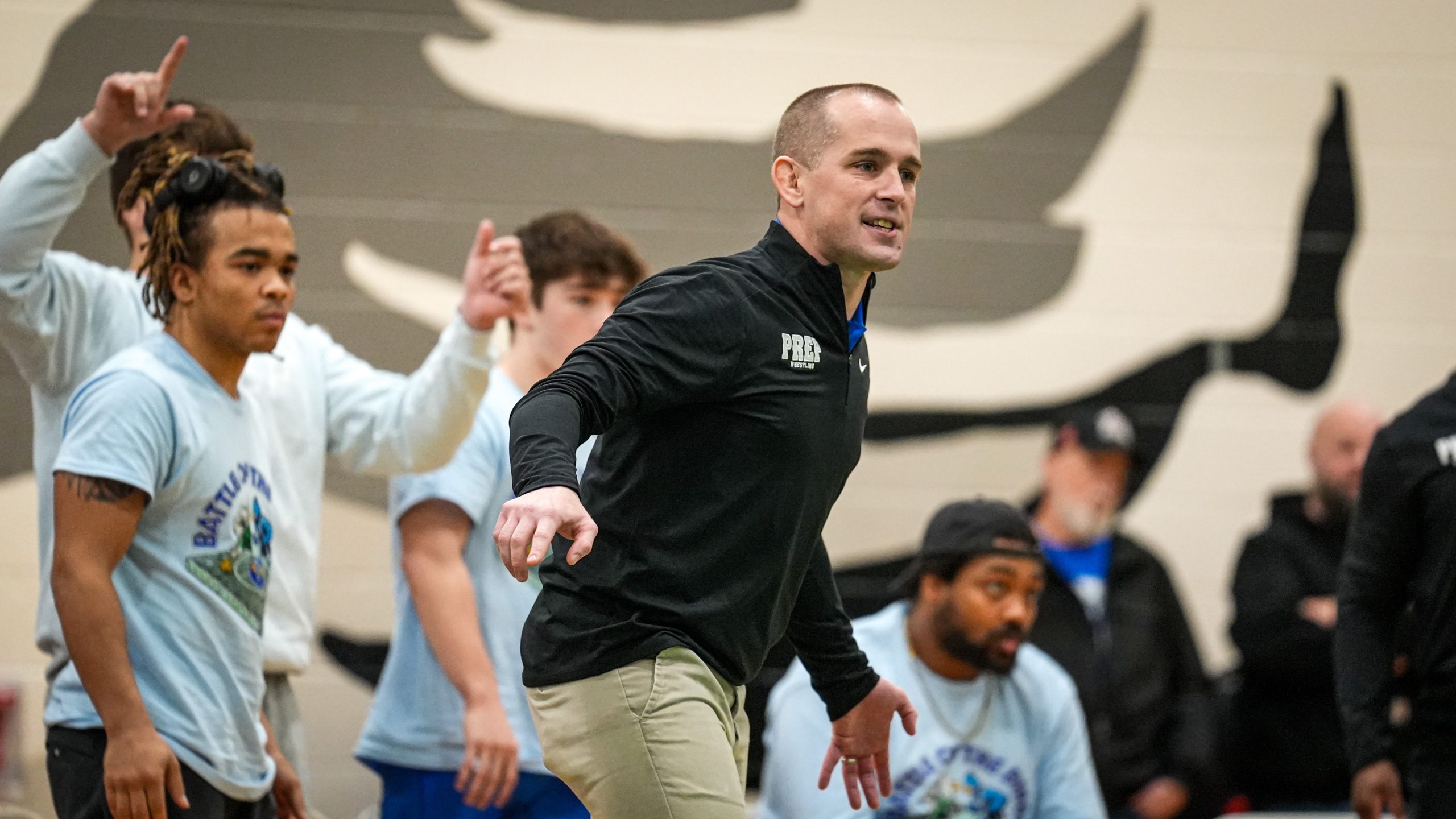 Creighton Prep coach Andrew Fisher guides his team during action earlier this season. (For Harvest Sports / Dru Kastler, NEWreslte)